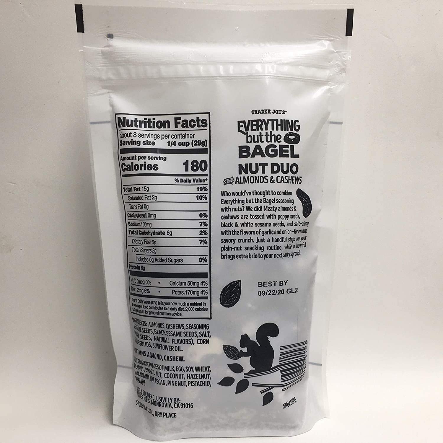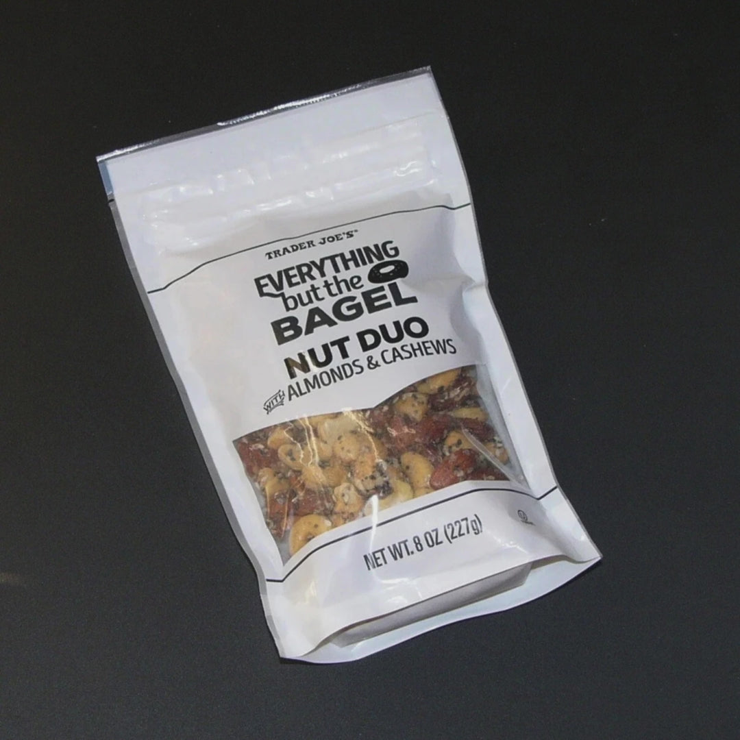 এভরিথিং বাট দ্য ব্যাগেল নাট ডুও - সুস্বাদু মিক্সড নাটস - স্বাদযুক্ত টুইস্ট সহ। আইকনিক এভরিথিং বাট দ্য ব্যাগেল সিজনিং দিয়ে তৈরি মুচমুচে মিক্সড বাদামের নিখুঁত মিশ্রণে নিজেকে মেশান। এই সুস্বাদু বাদাম ডুওটিতে তিল, রসুন, পেঁয়াজ এবং পোস্ত বীজের এক গাঢ় মিশ্রণে ভাজা বাদাম এবং কাজু মিশ্রিত করা হয়েছে। দিনের যেকোনো সময় এটি একটি সুস্বাদু নাস্তা।