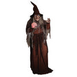 Your future unravels in the hands of a decrepit old 68-inch Digiteye Soothsayer Witch Animated Prop with dark inclinations. She grasps a mystical color-changing crystal ball, enticing spirits to draw close. Her Head Turns side to side and her Luminous Digiteyes (a patented technology) spring to life when you enter her proximity, while her hand waves back and forth. A Ragged tattered Shawl is draped around the shoulders of the crone's aging long brown robe. Gnarly teeth protrude from the Soothsayer's Moving Mouth as she recounts one of Five discomforting Phrases: