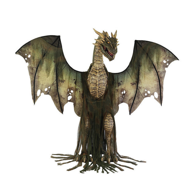 Beware the Winged Serpent has arrived - and it looks hungry! The 7-foot Dark Forest Dragon is a magnificent animated figure featuring molded-plastic head, neck, chest, and legs with matching draped-fabric wings.