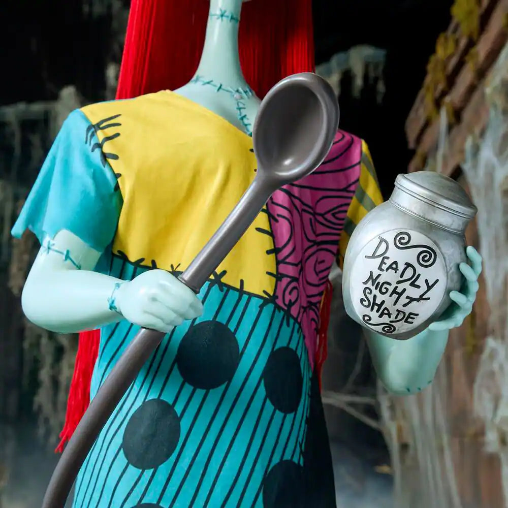 • Life-size 6-foot animated Sally in patchwork dress holding jar of Deadly Nightshade and spoon