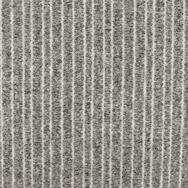 This Off Black-White striped stretch jersey knit fabric offers a soft hand with a stylish textured stripe pattern. Made from a polyester-cotton-rayon-spandex blend, it features horizontal, moderate vertical, and bias stretch for versatile comfort. With a very good drape and matte finish, it is ideal for activewear, apparel, blouses, and dresses.
