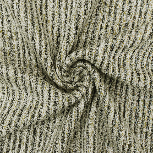 This textured stretch rayon rib knit fabric features a stylish blend of olive beige, black, and white tones. Its four-way stretch and soft ribbed surface provide both comfort and flexibility, ideal for sewing modern activewear, fashion-forward blouses, and casual dresses. Lightweight and opaque with a matte finish, it drapes well and offers a textured hand for added visual appeal.
