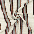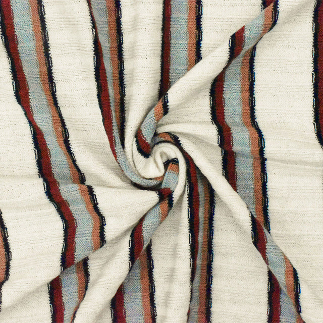 Lightweight 5x4 rib knit fabric featuring soft four-way stretch and a vibrant stripe pattern in off white, wine red, fog blue, blue black, and caramel beige. Made from rayon, polyester, and spandex, it drapes beautifully for activewear, dresses, blouses, and apparel with a matte finish and excellent durability.