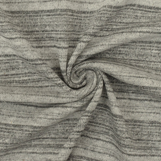 Lightweight and soft texture stripe stretch jersey knit fabric in vintage white and gray. Features moderate horizontal stretch, good drape, and a matte finish. Ideal for activewear, apparel, blouses, and dresses.