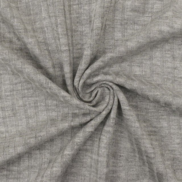 This heathered stretch rayon rib knit in tones of simple and pure gray offers a classic neutral with modern texture. Lightweight with a soft hand and great drape, it’s perfect for breathable and flexible garments like blouses, dresses, and activewear. The horizontal stretch adds comfort and shape retention.