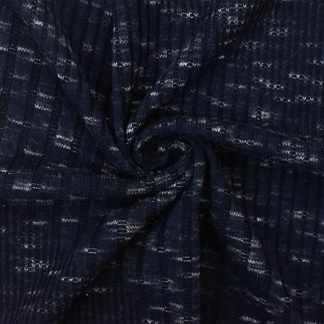 This soft and textured irregular diagonal rib knit fabric features a stylish slub pattern in dark navy blue and white gray. Made with a durable polyester-rayon-spandex blend, it offers four-way stretch, an opaque finish, and a matte luster—perfect for activewear, blouses, dresses, and apparel.