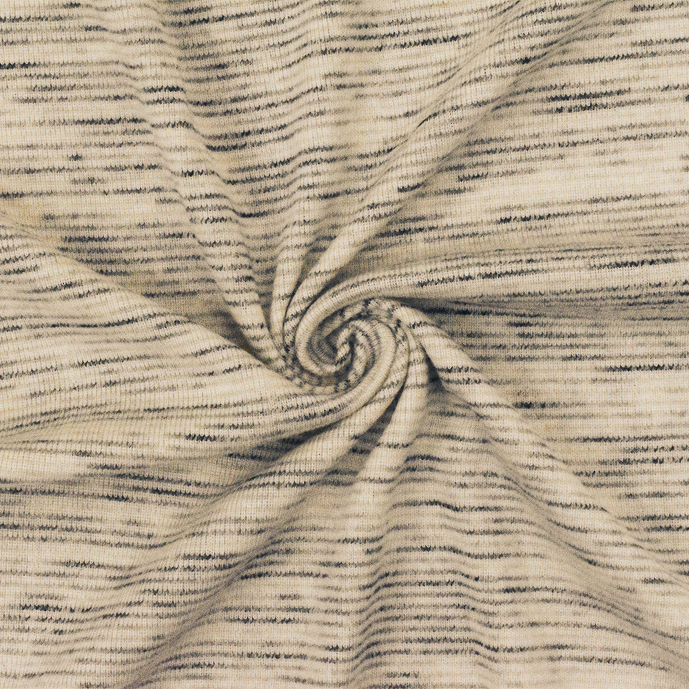 This slubbed striped stretch rib knit fabric features a blend of soft neutrals and subtle texture, offering visual interest and comfort in one. With a soft hand, horizontal stretch, and breathable structure, it’s perfect for stylish everyday apparel, activewear, or layering garments.