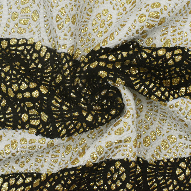 Add elegant sparkle to your creations with this Black-White-Gold Lace-Like Bonded Interlock Knit Fabric. Featuring a striped lace knit pattern bonded onto an interlock knit ground, it’s enhanced with metallic gold surfaces for a shimmering effect. Made from polyester, metallic fibers, and spandex, this light to medium weight fabric offers good drape and horizontal stretch with a textured hand. Ideal for apparel, dresses, costumes, jackets, and activewear. Machine washable for easy care.