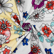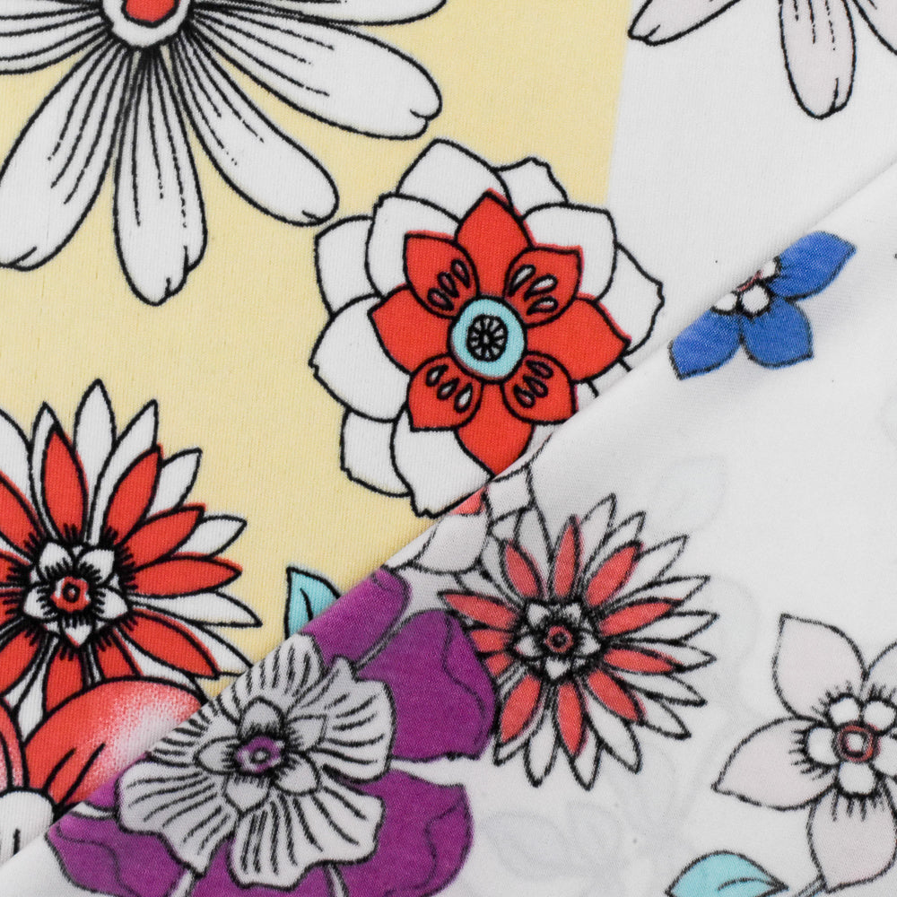 This vibrant Cream Yellow-Teal-Multi Floral Stretch Poly Swimwear Knit Fabric showcases a beautiful floral design with wide stripe accents, printed on a lightweight stretch knit. Crafted from a nylon-spandex blend, it offers a soft hand feel and moderate four-way stretch, making it ideal for swimwear and versatile apparel. With its matte finish, excellent drape, and lively colors, this fabric works well for both performance and style-forward clothing.