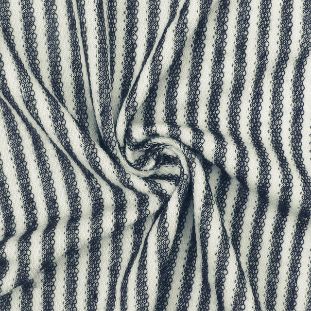 Discover the perfect blend of comfort and style with this Navy Blue White Striped Stretch French Terry Face Knit Fabric. Made from a premium polyester-rayon-cotton-spandex blend, this fabric offers a soft hand, moderate four-way stretch, and a light weight ideal for versatile apparel.