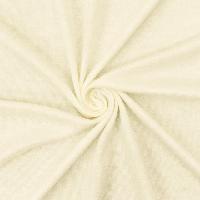 - Soft milk ivory rayon jersey knit fabric with solid horizontal, moderate vertical, and bias stretch for flexible and comfortable garment creation