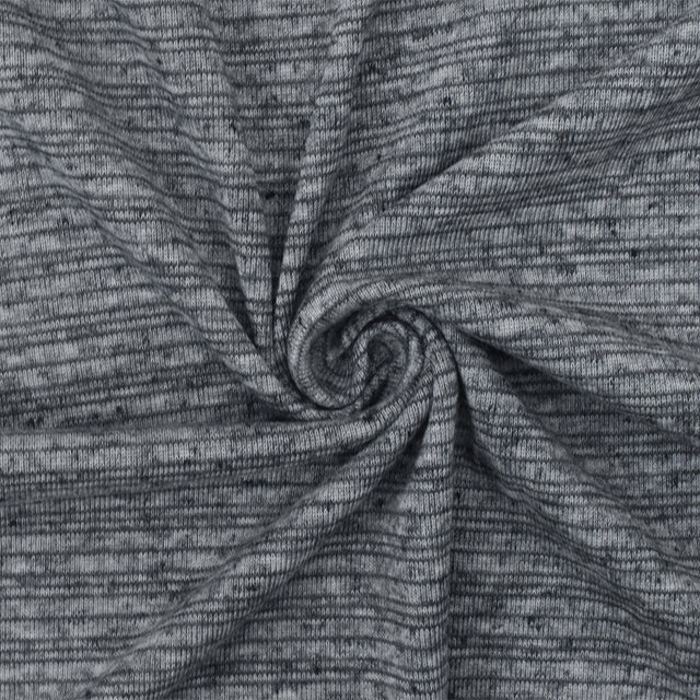 This cold gray, white, and black slub striped stretch jersey knit fabric features a soft hand and excellent drape for stylish apparel. The lightweight fabric has horizontal stretch and a matte finish, perfect for activewear, blouses, and dresses. It is opaque and easy to care for with machine wash cold and air dry instructions. The textured stripes add a unique visual appeal while providing comfortable wear for various garment projects.