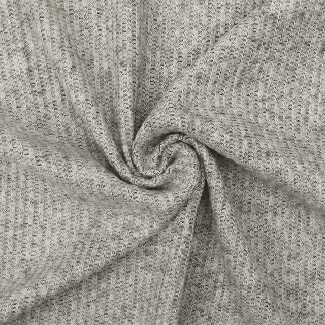 This textured 2x2 rib knit fabric in a Moon Gray, white, and black color blend offers a stylish and versatile look with a soft hand and four-way stretch. The lightweight fabric features a subtle ribbed surface with good drape and low luster, making it ideal for creating activewear, stylish tops, dresses, and casual wardrobe staples.