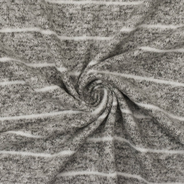Elevate your creations with this textured brushed jersey knit fabric in a classic Soft White, Black, and Gray striped palette. Made from a soft polyester-rayon blend, this lightweight fabric offers four-way stretch, a cozy brushed face, and a matte finish. Ideal for activewear, stylish blouses, dresses, and everyday apparel requiring comfort and drape.