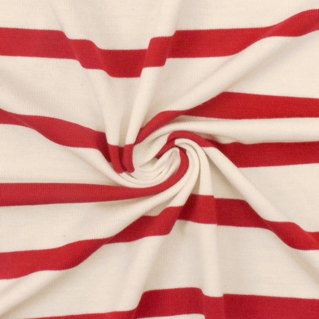- Rich red and ivory stripe jersey knit fabric with a soft, modern finish, perfect for fashionable blouses, dresses, and activewear