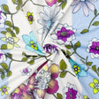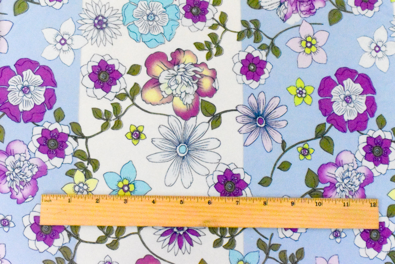 This angel blue purple multi floral printed fabric features wide stripes on a soft nylon polyester spandex swimwear knit with moderate four-way stretch for versatile activewear and apparel. Its lightweight opaque construction offers very good drape and a matte finish, ideal for blouses, dresses, swimwear, and dancewear. The fiber content combines nylon, polyester, and spandex to provide durability, flexibility, and comfort. Machine washable and easy to care for, this fabric is perfect for stylish, breathable, and functional clothing projects.