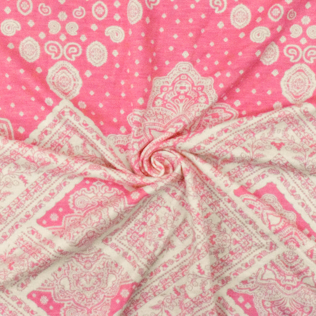 This geranium pink white baroque border printed fabric features a mini paisley pattern on a soft rayon ITY jersey knit with horizontal, slight vertical, and bias stretch for versatile activewear and apparel use. Its lightweight opaque construction offers very good drape and a matte finish, perfect for blouses, dresses, and stylish garments. The fiber content of 96% rayon and 4% spandex ensures softness, comfortable stretch, and durability in every garment. Machine washable and easy to care for, this fabric is ideal for breathable, elegant clothing projects.