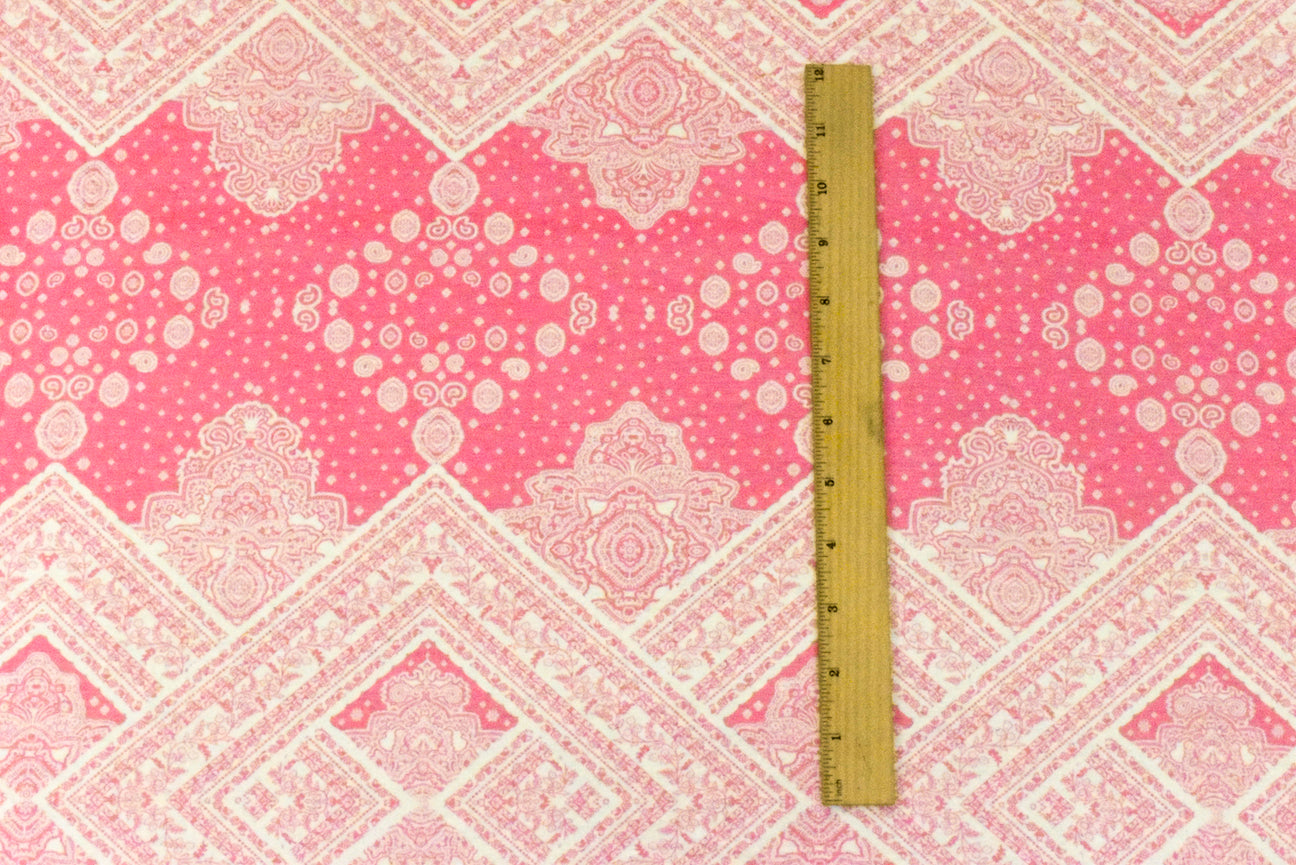 1 Yard Geranium Pink White Baroque Border Printed Stretch Rayon ITY Jersey Fabric, Ideal for Breathable, Elegant Clothing Projects 62" Width