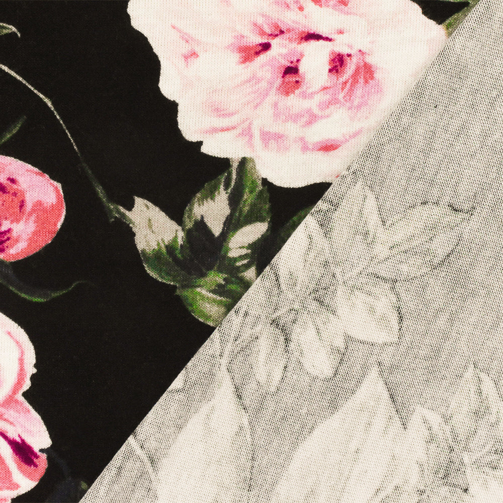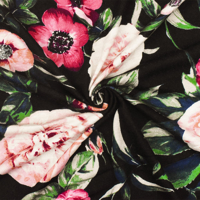 This black pink multi floral fabric is a soft stretch rayon spandex jersey knit featuring four-way stretch, perfect for versatile apparel and activewear designs. Its lightweight to medium weight opaque construction offers very good drape and a matte finish, ideal for dresses, blouses, dancewear, and casual garments. The fiber content of 97% rayon and 3% spandex provides breathability, softness, and durable stretch for comfortable wear. Machine washable and easy to maintain, this fabric suits stylish, breathable clothing projects.