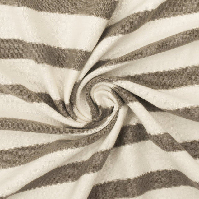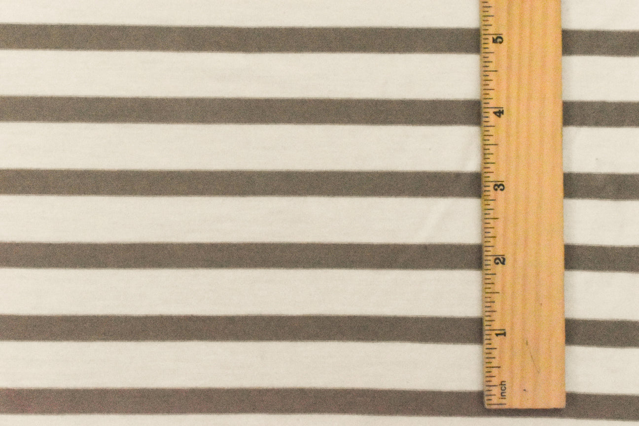 - Soft taupe brown and ivory stripe jersey knit fabric with a soft, modern finish, perfect for fashionable blouses, dresses, and activewear