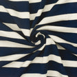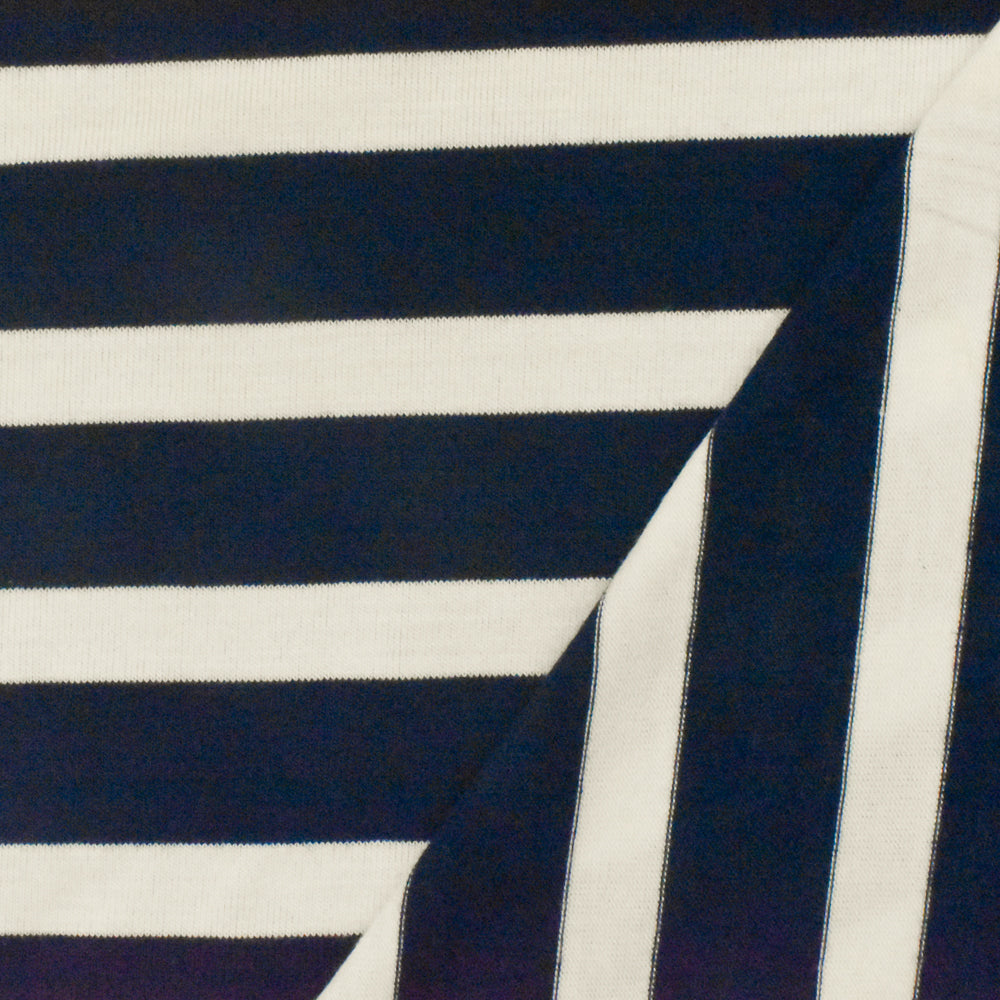 - Dark navy and ivory stripe jersey knit fabric with a soft, modern finish, perfect for fashionable blouses, dresses, and activewear