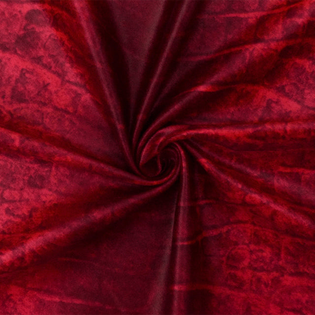 This Hot Red and Deep Burgundy Reptile Printed Satin Tricot fabric features a striking realistic reptile-skin pattern with a lustrous finish. Made with high-quality nylon and spandex blend, it offers four-way stretch and full-body drape, perfect for swimwear, activewear, costumes, and stylish apparel. Its soft, cool hand feel enhances comfort, while the light to medium weight makes it versatile for various sewing projects.