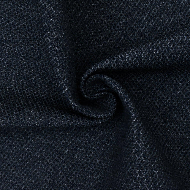 This black gray diamond dobby woven fabric features a textured dry hand with a subtle geometric pattern. Made from polyester spandex, it offers vertical and bias stretch for flexible comfort and durable wear. The lightweight to medium-weight fabric has a matte finish and full body drape, perfect for dresses, jackets, and activewear. Its sophisticated color palette of night black and office gray makes it ideal for professional and casual fashion projects.