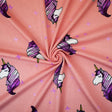 Bring fun and comfort to your sewing projects with this Pink Multi Unicorn Star Print Double Brushed Jersey Knit Fabric. Featuring playful unicorn and star motifs on a soft pink background, this fabric offers a charming design with the softness and flexibility needed for apparel.