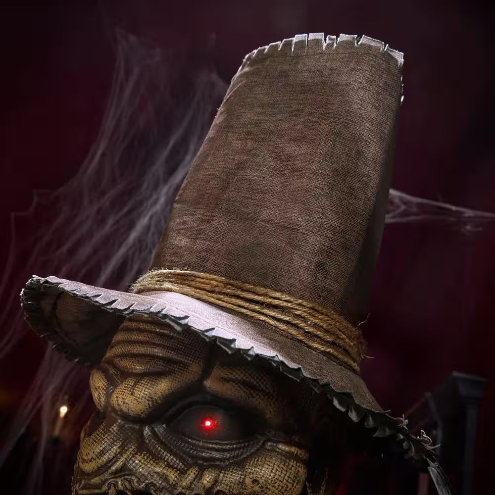 • Life-size 6.5-foot Soul Slasher animatronic with glowing red LED eyes and sickle prop for creepy effect