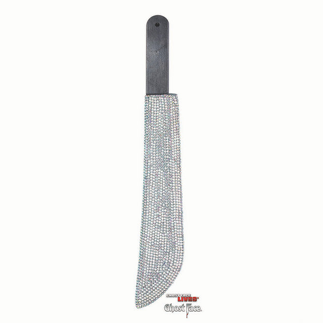 Create a brilliant accent when you add our Ghostface Bling Machete to your horror Halloween costume! This stunning accessory features a black wood-look handle with a silver rhinestone-covered blade, making it a must-have for any ghost-themed outfit. The machete measures 21 inches long and is made of safe plastic, ensuring durability and safety during your festivities.