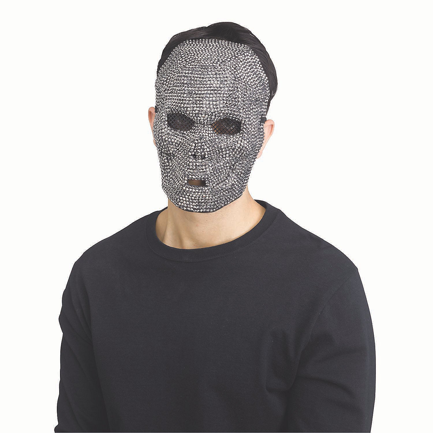 Spooky and sparkly! Our Bling Skull Mask in a gunpowder grey is covered in clear rhinestones, with nose and mouth openings for ventilation. The eye openings are covered in a black fishnet material to give the effect of hollow eye sockets. The elastic headband ensures a secure fit and comfort.