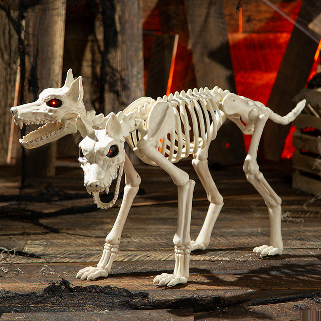 Create spine-chilling thrills for trick-or-treaters and passersby with this animated Doberman skeleton. This unique decoration features a two-headed dog skeleton that includes light-up red eyes, perfect for captivating your guests.