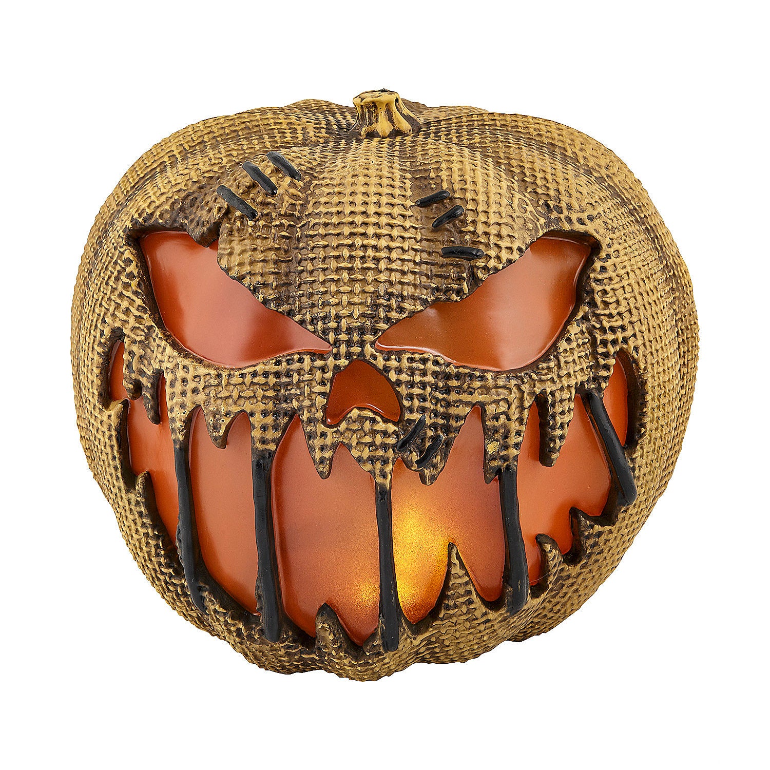 Level up your favorite Halloween haunt with the impressive 14" Flaming Burlap Pumpkin! Our detailed jack-o'-lantern with a rustic burlap-look finish has a realistic LED flickering flame effect showing through the eyes and mouth. When switched to timer mode, the prop will run continuously for 6 hours then pause operation for 18 hours. It will then automatically resume continuous operation for 6 hours, perfect for your Halloween Decor time window.