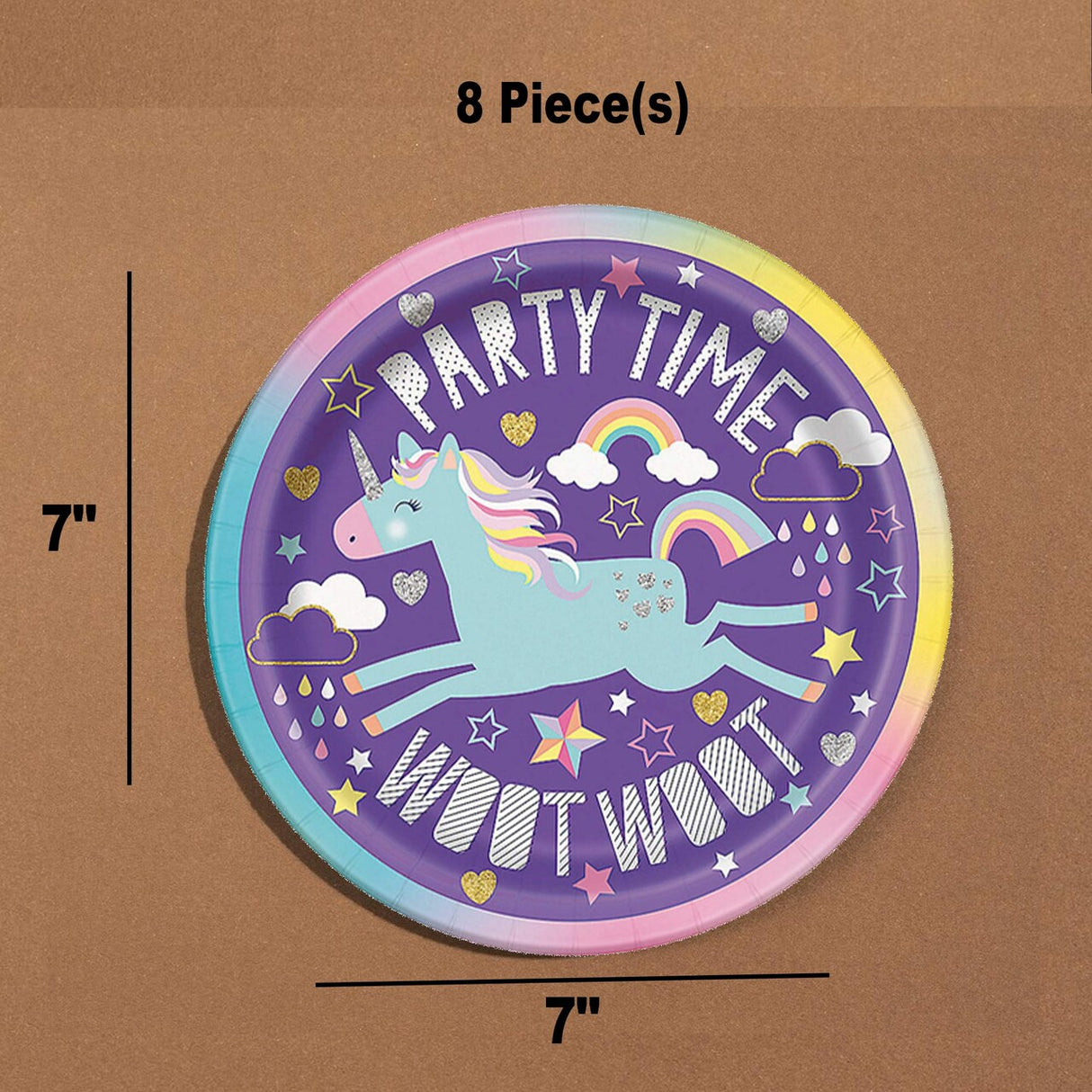 Add a touch of magic to your celebration with these enchanting unicorn-themed dessert plates. Featuring a pastel rainbow design, these 7-inch round paper plates are perfect for serving cake and treats at unicorn-themed birthday parties. With 8 disposable plates per pack, cleanup is a breeze, allowing you to enjoy more time with your guests.