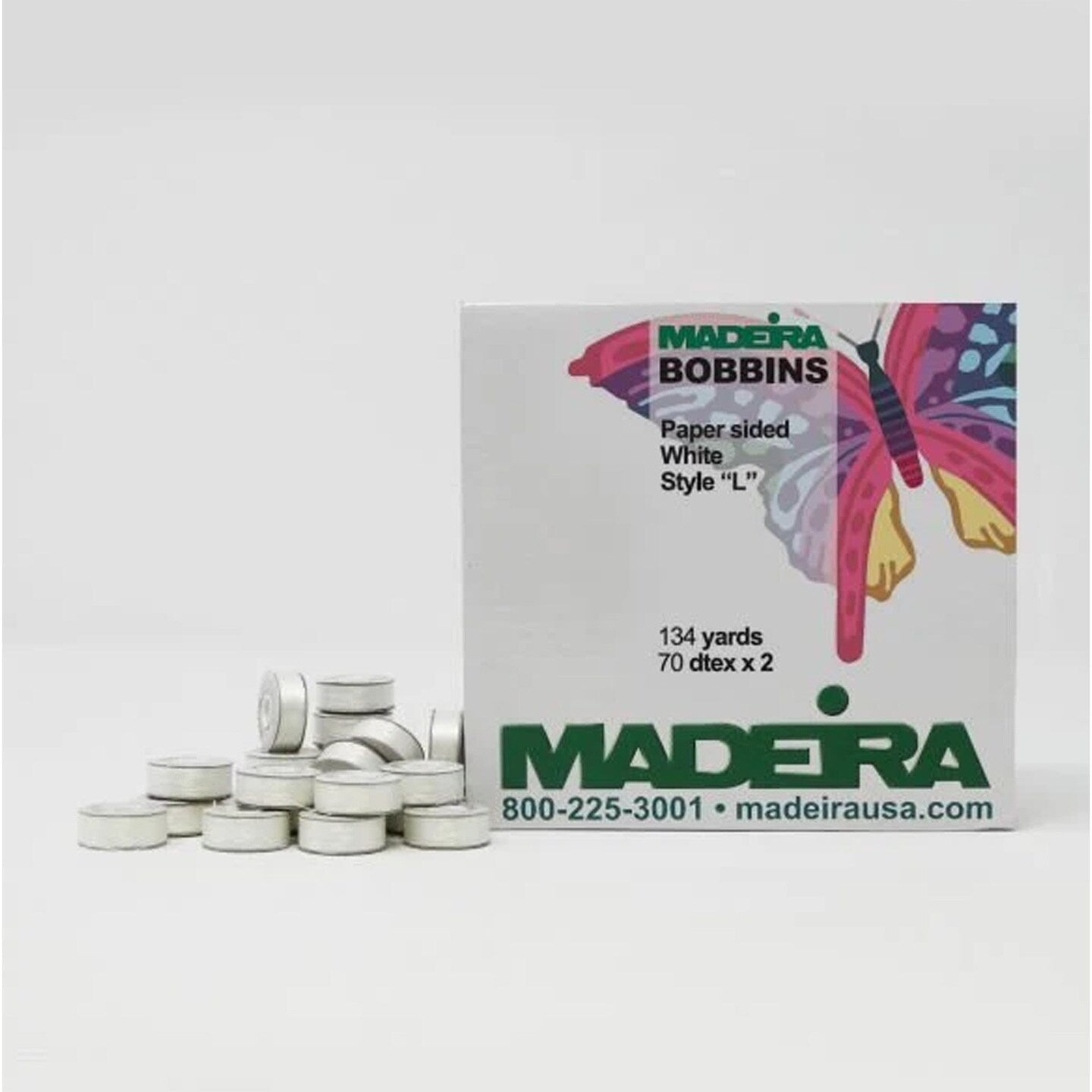 Madeira Sided Bobbin White L is a high-quality sewing accessory designed for efficiency and durability in high-volume embroidery projects. Featuring semi-rigid paper sides, this bobbin provides strength and cost-efficiency while minimizing lint buildup, reducing friction, and extending the life of your equipment. Pre-wound for convenience, these bobbins save time and ensure consistent performance, making them a perfect choice for large-scale embroidery operations.