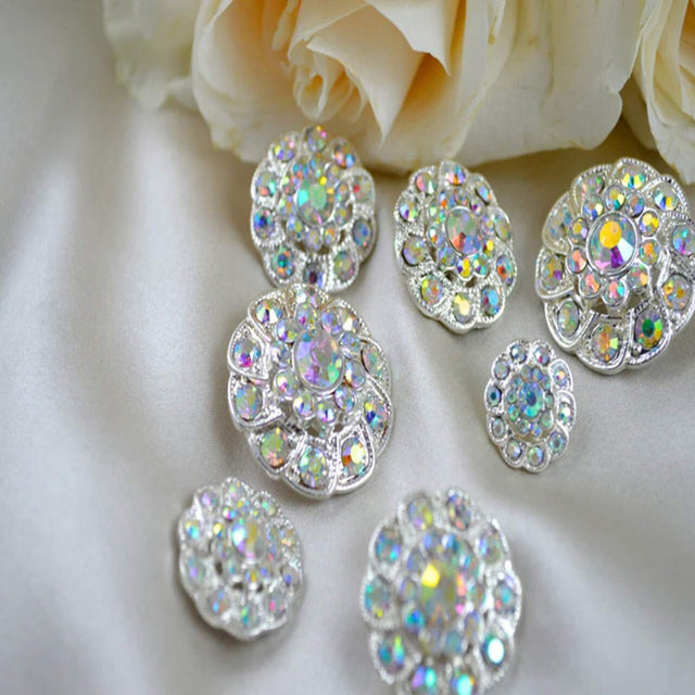 This stylish silver-tone button features a dome-shaped floral design adorned with AB (aurora borealis) rhinestones. Measuring 7/8", it provides the perfect embellishment for bridal garments, hats, handbags, or floral arrangements. The shimmering rhinestones shift color beautifully in the light, making this button a luxurious choice for your DIY needs.
