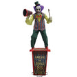 Step right up, ladies and germs! Standing atop his Carnie of Souls podium, the 6 ft. Carnival Barker tries to lure an unsuspecting audience to their doom. His brightly colored pants, vest and shirt are topped by a nightmarish face with attached purple hair and a tiny hat. His Digi-Eyes appear to blink and look around while his moving mouth speaks several creepy phrases and his head turns side to side. This decoration pivots at the waist and his arms move up and down while he holds his megaphone and cane. Strangely creepy carnival music plays in the background. Easily plugs into any normal wall outlet.