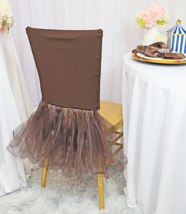 Enrich your special event with the rich warmth of our Chocolate Ballerina Spandex Chiavari Chair Cover. Tailored to perfectly fit Chiavari chairs, this cover offers a sleek and sophisticated upgrade for weddings, banquets, parties, and other formal occasions. The deep chocolate shade adds an inviting, luxurious ambiance to your décor, making every seat a statement of elegance. Made from high quality 4 way stretch spandex, this chair cover hugs the chair tightly while maintaining a smooth and polished finish. The elegant ballerina style skirt flows gracefully, inspired by classic tutus, adding a soft, enchanting detail to your seating arrangement.