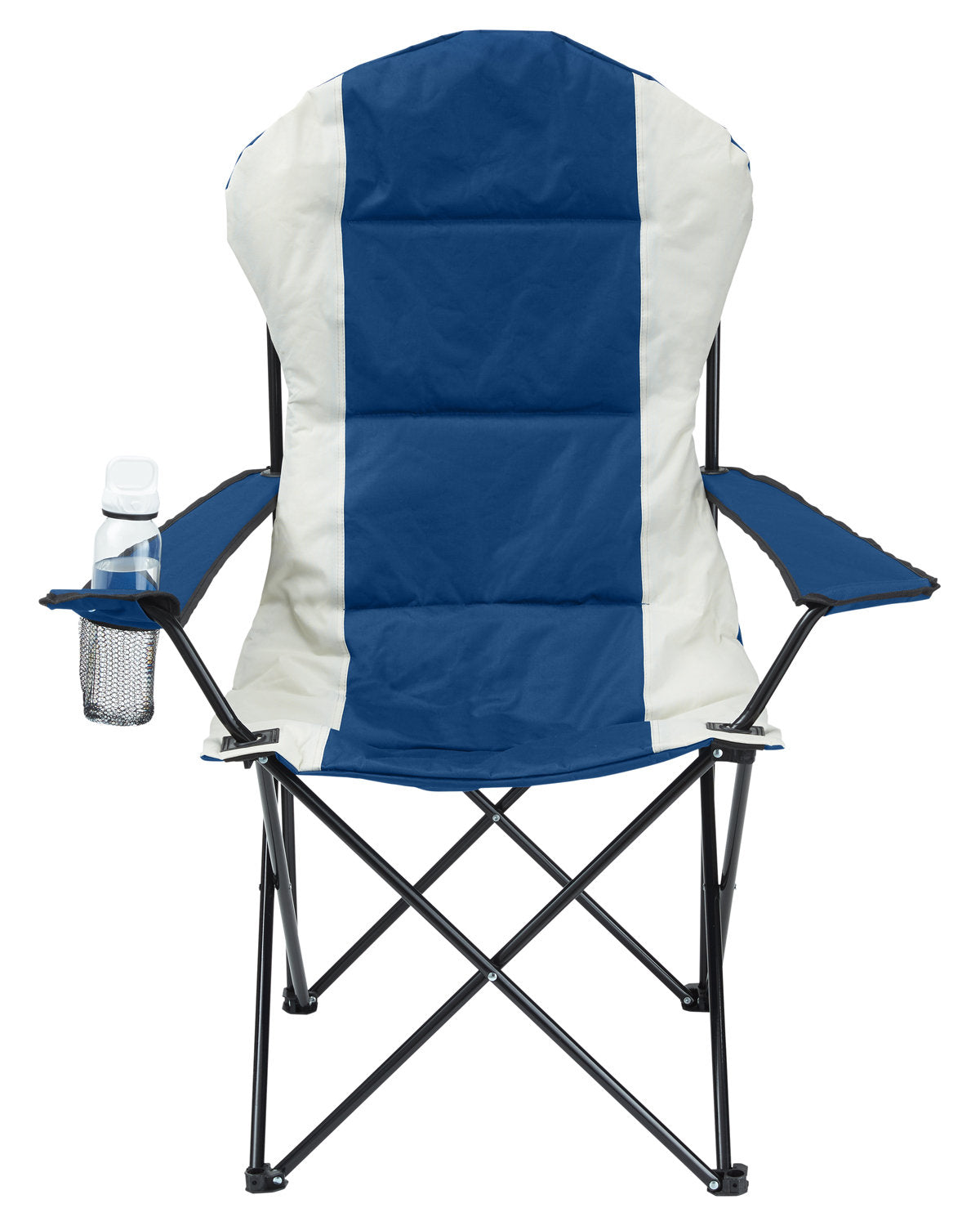 This 600D polyester folding chair offers ultimate comfort with its extra-large size and padded seating. It folds down to an easy-to-carry size and includes a carrying pouch. The chair features a cup holder to hold your favorite beverages and can support up to 300 lbs. Ideal for outdoor relaxation, it measures 28"w x 42.9"h x 22.8"d and folds into a compact pouch of 39.3"l x 10" dia.