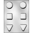 Triangle 2" x 2" x 3/4" Square 1-3/4" x 1-3/4" x 3/4" Circle 2" Diameter x 3/4" Depth 6 cavities per mold. Estimate 20 pieces per pound of chocolate.