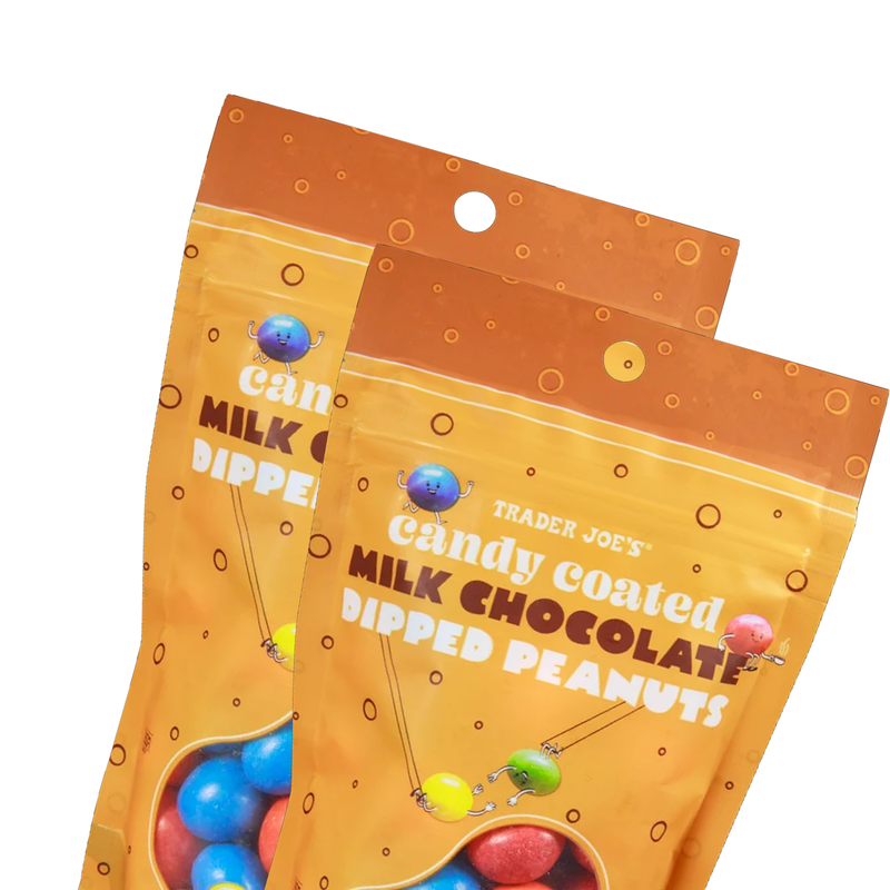 Trader Joe’s Candy Coated Milk Chocolate Dipped Peanuts combine the crunch of roasted peanuts with smooth, high-quality milk chocolate and a colorful candy shell. These bite-sized treats are made with natural colors, delivering a delightful, sweet snack experience.