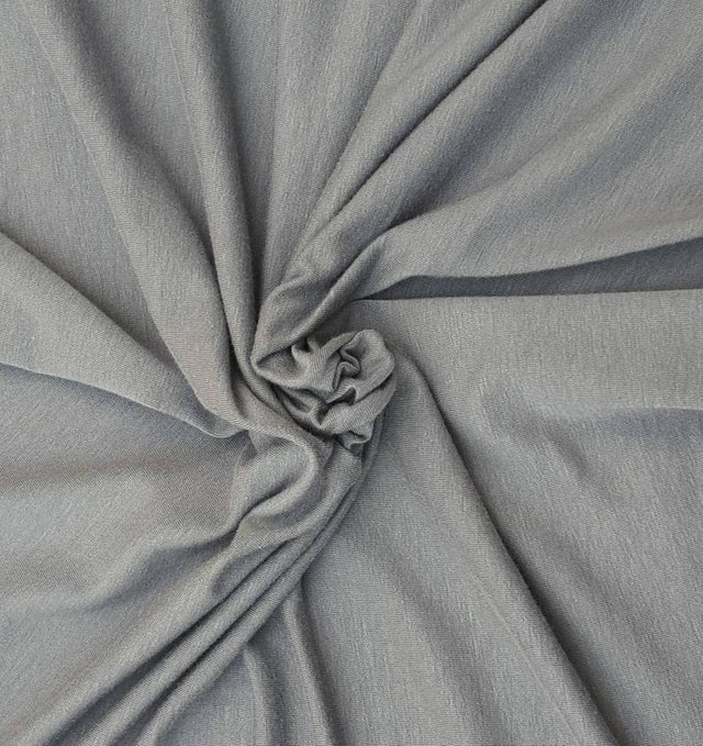 This smoke colored bamboo cotton spandex jersey knit offers an ultra soft feel, natural stretch, and breathable comfort. Made from a sustainable blend of bamboo, cotton, and spandex, this fabric drapes beautifully and is ideal for crafting comfortable everyday wear like t shirts, dresses, leggings, and baby clothing. Its smooth finish and cool toned neutral shade bring both function and fashion to your handmade pieces.