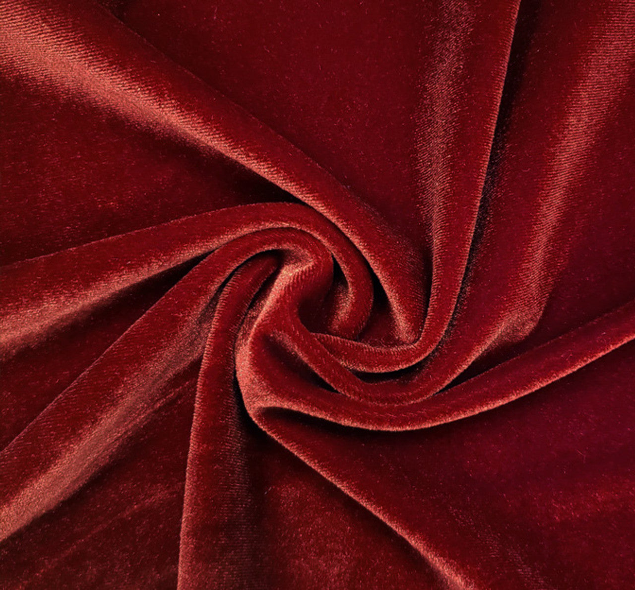 This Scarlet Stretch Velvet fabric is made from 90% polyester and 10% spandex. It features an ultra-soft hand finish and elegant drape with a medium weight of 360gr/yd and 58/60" width. The fabric stretches across the grain, making it ideal for evening wear, skirts, leggings, dancewear, costumes, and holiday apparel. Also suitable for home décor and craft projects. Machine washable (cold) for easy care.