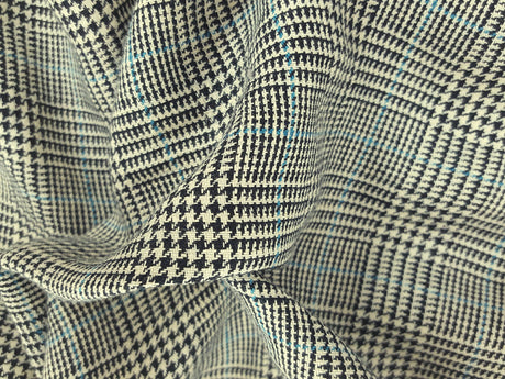 1 Yard Vintage Houndstooth Plaid Black Ivory Blue Yarn Dye Woven Linen Fabric