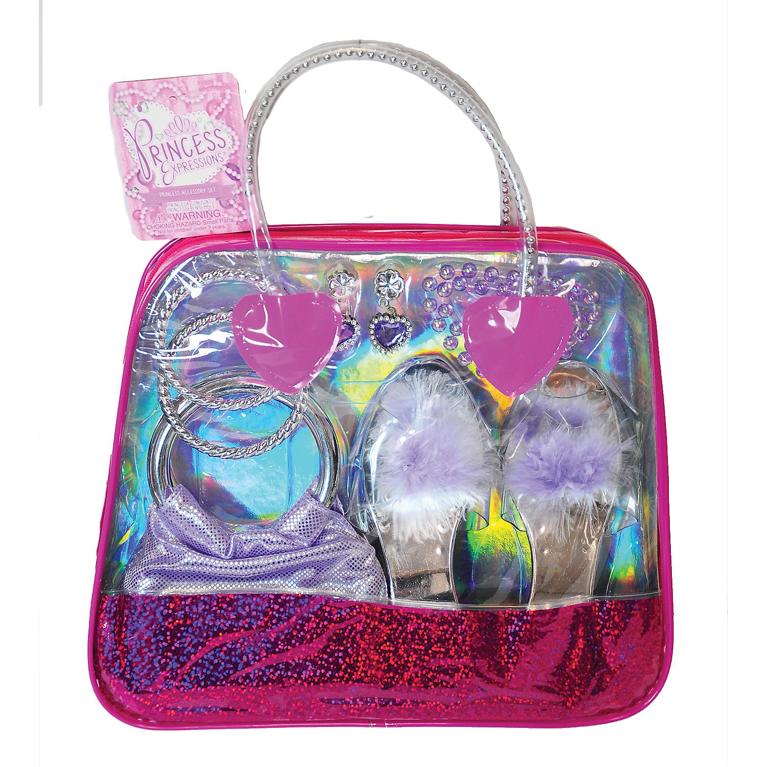 Princess Dress Up Kit with Carry Bag contains everything your little princess would love. Just add a pretty dress and you are all set! Complete set comes with earrings, faux pearl necklace, 2 bracelets, a beautiful handbag, a pair of heeled slippers with accent fur, and a zipper carrying case with handles.
