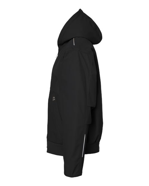 - Three-piece hood with collar stand and interior adjustable cord lock