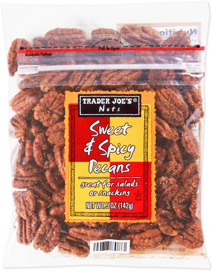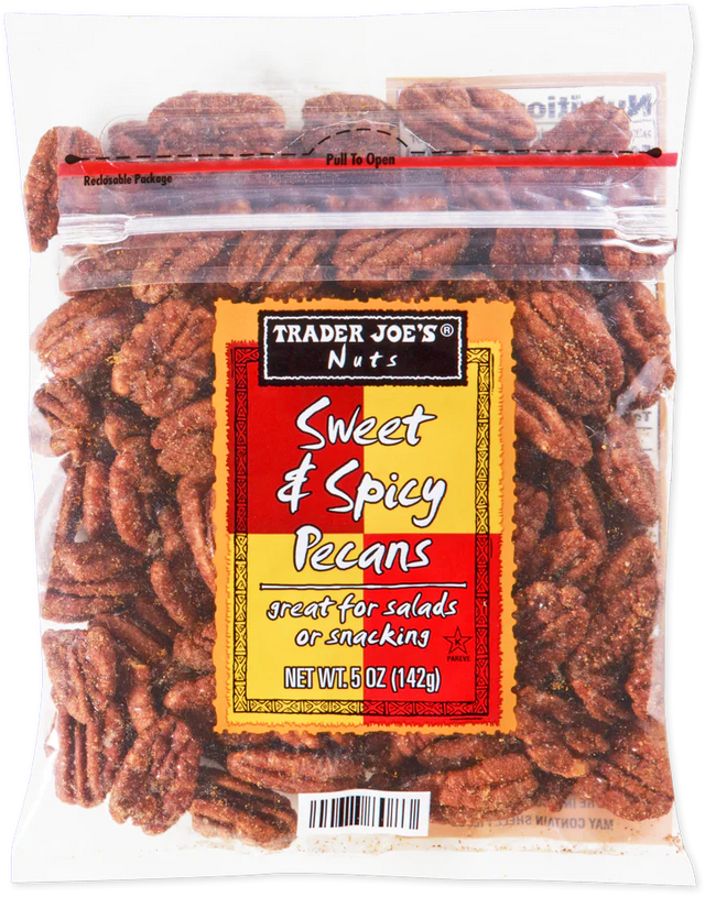 Trader Joe’s Sweet & Spicy Pecans are crafted from high-quality Texas pecan halves, roasted to perfection and seasoned with a blend of sugar, salt, cayenne, ancho chile, and paprika. With just the right balance of sweetness and heat, they make a perfect snack, salad topper, or complement to cheese boards.