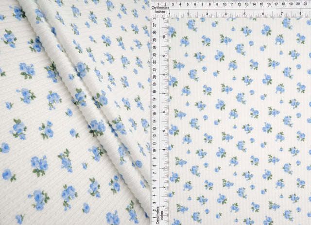 1 Yard Double Knit Ditsy Print Fabric 230 GSM Polyester Rayon Spandex Blend 56/57" Width - IVORY/BLUE is backordered and will ship as soon as it is back in stock.