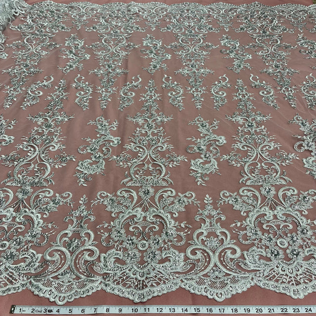 1 Yard Ethereal Beaded Corded Bridal Lace Fabric Embroidered on Premium Mesh 54