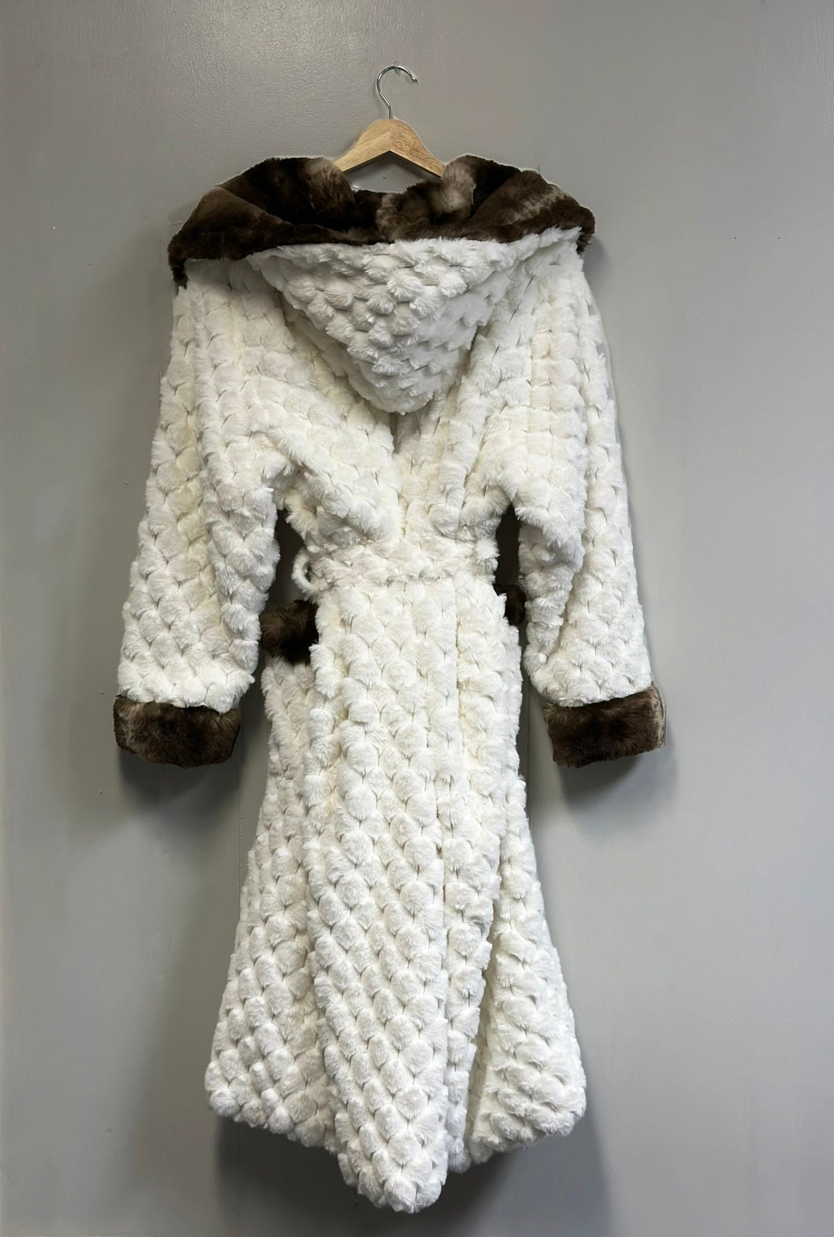 Winter Luxurious Offwhite Faux Fur Hooded Robe Plush Velvet Lined